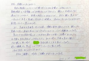 先生にお世話になり始めてから、みるみるうちに成績が上がり、2年生の後期には、学校の担任の先生が驚いて、算数の成績順順位を教えて下さる程でした。